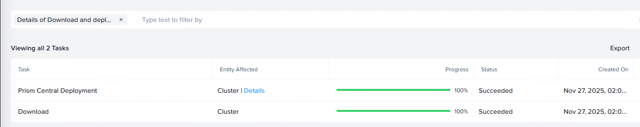 When you hit deploy, you will get a couple of new tasks in the Prism Element’s task list. If all your network requirements are in order, you should have your new Prism Central instance ready in approximately 30–40 minutes, depending on your deployment.